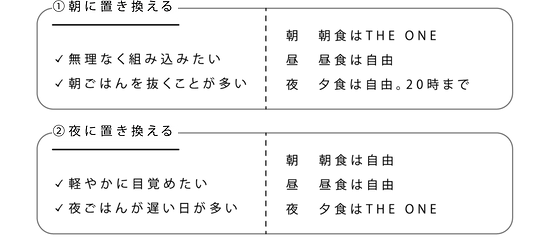 断食時間中は、水、ハーブティー、THE ONEを摂取します。※カフェインが含まれるものは空腹時に刺激になりやすいので、1-2杯程度までに抑えることを心がけてみてください。